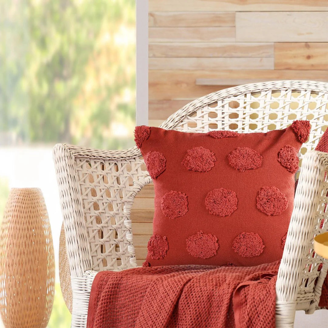 Add a playful pop of texture and color to your space with the Rusty Confetti Cushion. Hand-tufted with raised polka textures on a bold terracotta base, this piece is the perfect mix of cozy and quirky. Whether you throw it on your bed, sofa, or accent chair, it instantly livens up the vibe with its statement look.
